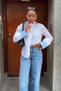 De DonnaCC Fold Cuff Blouse van Co'Couture is een oversized blouse in wit met knoopsluiting en reverskraag. De omgevouwen mouwen geven ‘m een nonchalante touch, terwijl de blauwe onderkant zorgt voor een verrassend detail. Speels, modern en moeiteloos opvallend.