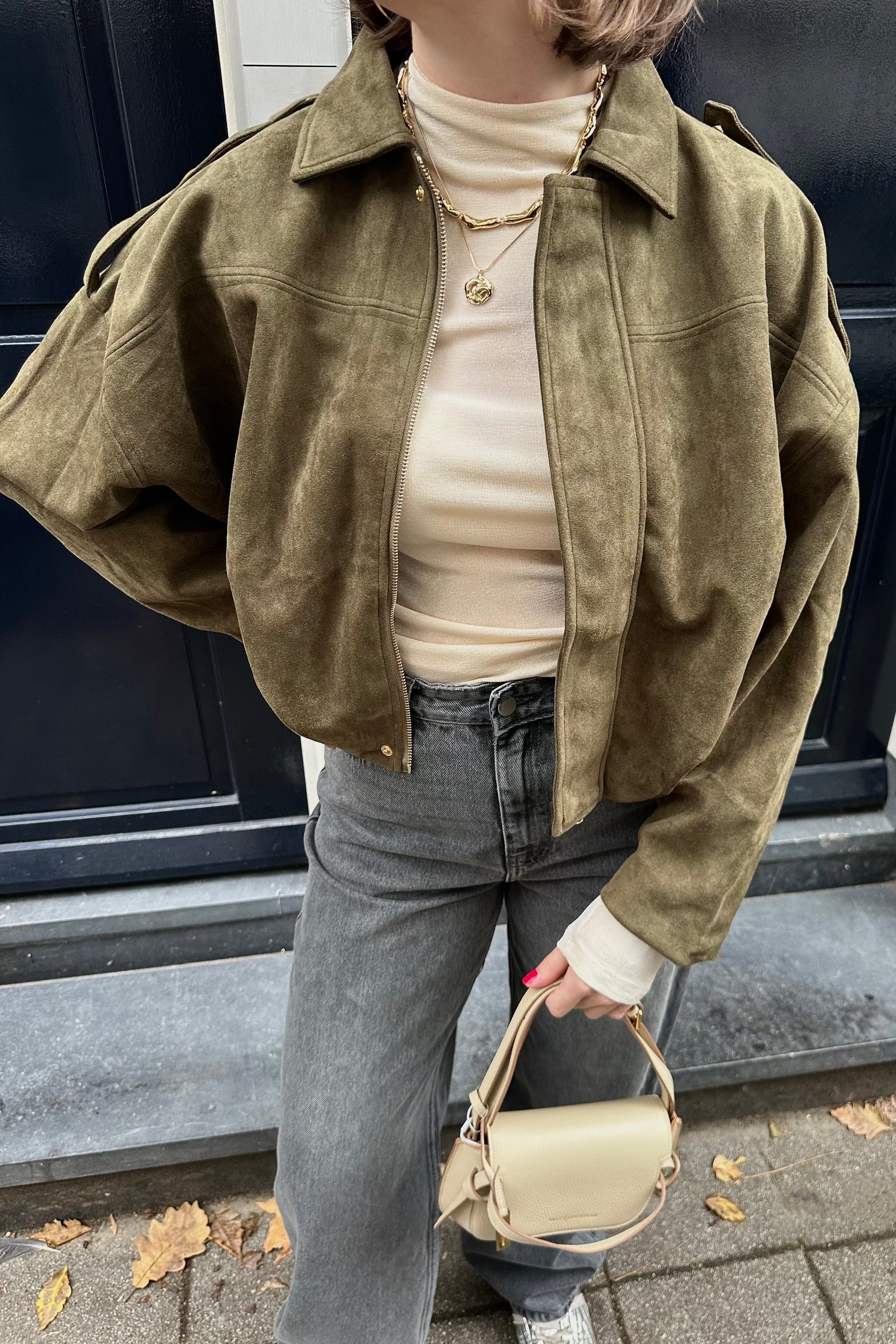 Katie Suede Jas van UNC Wardrobe is een bomberjack in groen suede. Voorzien van een ritssluiting en een klassieke kraag, met een stoere maar tijdloze uitstraling. Een statement piece dat elke outfit direct krachtiger maakt.