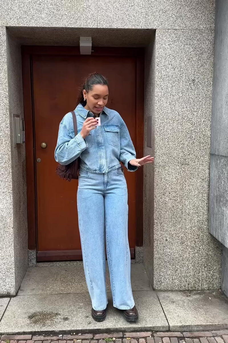 De Crowd Denim Jas is een licht denim jasje met een ritssluiting en een dunne stof met een grover denim patroon. De aantrekbare touwtjes aan de onderkant zorgen voor een verstelbare taille en geven het jasje een nonchalante, moderne uitstraling.