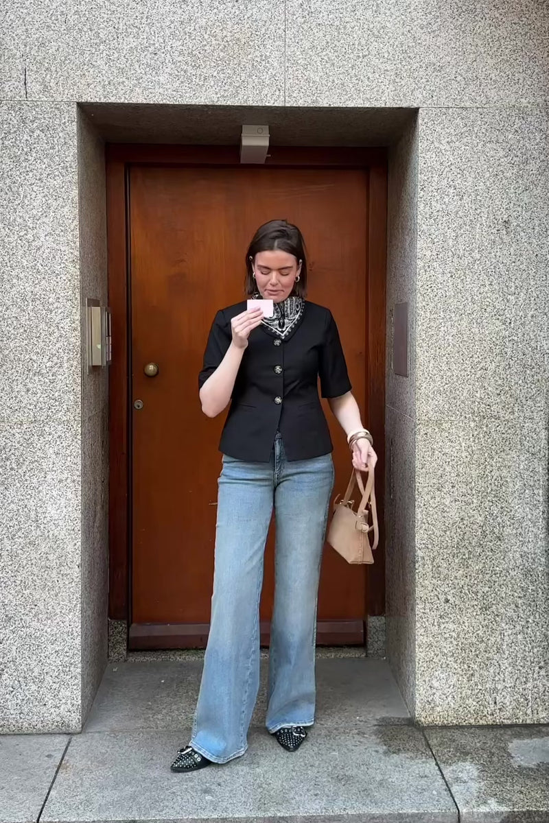 De Kasaundra Blazer van Noella in zwart is een korte mouwen blazer met knoopsluiting aan de voorkant en twee zakken. Het tijdloze zwarte model maakt de blazer veelzijdig en geeft elke outfit direct een krachtige, elegante touch.