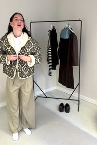 De Lizet jas is een perfecte combinatie van warmte en stijl. Met een zachte wolvoering aan de binnenkant houdt hij je heerlijk warm tijdens koude winterdagen. De buitenkant heeft een speels groen-wit patroon en wordt afgewerkt met mooie knoopjes voor een elegante touch. Een ideale jas om fashionable én comfortabel de winter door te komen.