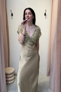 De Elodie Sequin Jurk van Never Fully Dressed is een lange gouden showstopper. Bovenkant vol glinsterende pailletten, onderkant soepelvallend als een klassieke slipdress. Glam met een vleugje nonchalance.