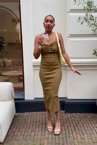 De Lilian Jurk van Edited heeft spaghetti bandjes en een rechte halslijn voor een minimalistische look. Bij het decolleté zit een opvallend detail: een zilveren ring met daaraan een natuursteen. Subtiel speciaal, vrouwelijk en perfect voor warme dagen.