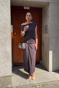 De Minja Drapy Jurk is een strakke, bruine bodycon met een flatteus taille detail en een zilveren buckle als eyecatcher. Stoer en vrouwelijk tegelijk, met nét dat beetje extra om op te vallen zonder overdreven te zijn.