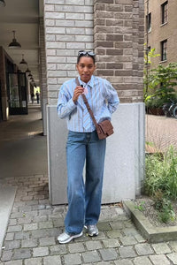 De AmoraCC Stripe Tie Blouse van Co'Couture is een korte blauwe blouse met verticale strepen in camel en wit. De rug heeft een subtiele overslag en de afneembare stropdas geeft je de keuze tussen klassiek of nonchalant.
