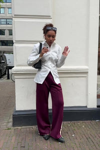 De Puggy Joggingbroek van Neo Noir in de kleur bordeaux en crème combineert stijl en comfort op unieke wijze. Met een speels knoopdetail aan de onderkant van de broekspijpen, die je naar wens kunt openen, geeft deze broek een moderne twist aan de klassieke joggingstijl. Perfect te dragen naar kantoor of tijdens een ontspannen dagje weg. De langere pasvorm maakt het een veelzijdig en trendy item.