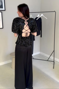 De Marsja Blouse van Harper & Yve is dé eyecatcher voor het feestseizoen. Deze zwarte blouse is bezaaid met glinsterende pailletten en heeft speelse 3/4 pofmouwen voor een chique uitstraling. Perfect om te dragen naar een feestje of om je dagelijkse look een glamoureuze touch te geven. Combineer met een rok of nette broek voor een feestelijke outfit, of stijl met een jeans voor een stijlvolle, casual vibe.