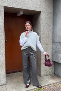 De Loua pants van Amaya Amsterdam is een wijde faux leather broek met een soepele fit en stoere look. Gemaakt in hetzelfde olijfgroen als de Jeany jas, maar ook verkrijgbaar in grijs. Perfect als statement piece of als complete set voor een krachtige, stijlvolle outfit.