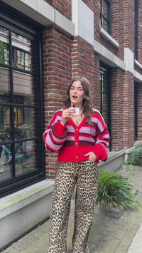 Het Noor Vest van Harper & Yve is een kort vest met een diepe V-hals en opvallende horizontale strepen in rood, bordeaux en lila. De grote gouden knopen maken het geheel speels en chic tegelijk.