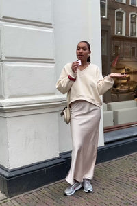 De Athena Sweater is een lange mouwen trui met een nonchalante V-hals, gemaakt van een stevige joggerstof die comfy én stijlvol aanvoelt. Verkrijgbaar in beige en grijs, perfect voor een relaxte look met een vleugje luxe. Easy om solo te dragen of te combineren met je favoriete jogger.