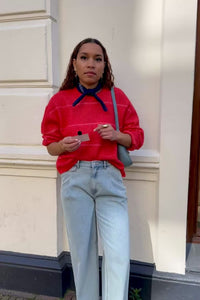 De Nenaya Trui van Moss Copenhagen is een prachtige rode trui met witte strepen, perfect voor een casual maar stijlvolle look. De pofmouwen en hoge hals geven de trui een trendy en vrouwelijke uitstraling. Een ideale keuze voor zowel een comfortabele als chique outfit.
