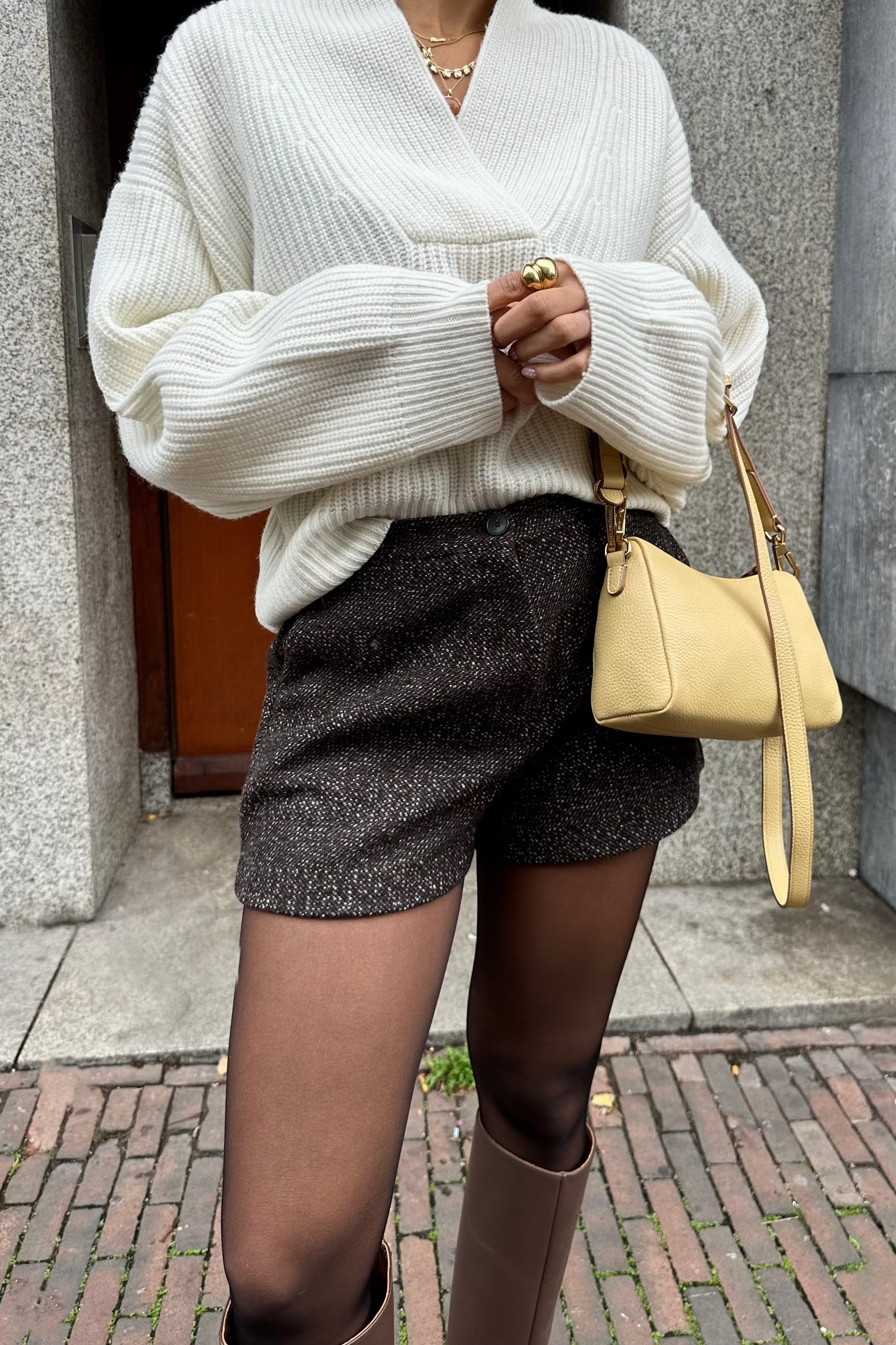 De Hayden Korte Broek van Edited is een mid-waist short in een gemêleerde bruine tint, gemaakt van een zachte wolmix. Chic, comfy en ideaal voor een geklede maar easy look.