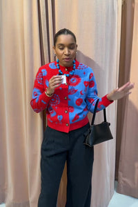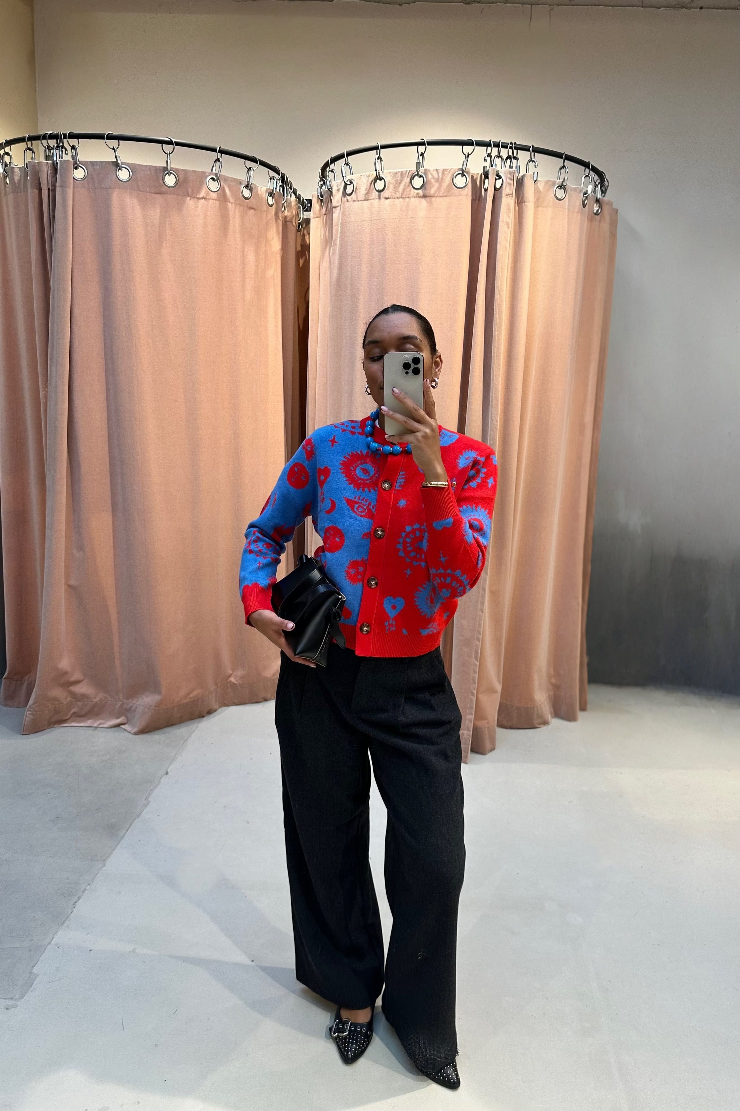 Het Holly Vest van Never Fully Dressed is een opvallend vest met een dubbelzijdig design: aan de ene kant rood met blauwe figuren, aan de andere kant blauw met rode figuren. Speels, kleurrijk en vol karakter. Een echte eyecatcher voor je outfit.
