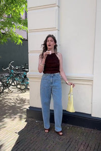 De Lindy Top in bruin is een luchtige haltertop met geplooide lagen en subtiele kantdetails. De open rug geeft een zomerse en vrouwelijke touch. Gemaakt van een lichte, soepelvallende stof – perfect voor warme dagen.