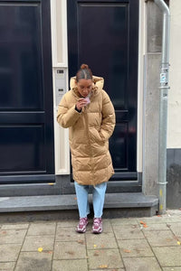 De MSCH Zala Pavinaria Jas van Moss Copenhagen is een lange, warme pufferjas met een hoge kraag en capuchon. Uitgevoerd in een stijlvolle mix van camel en donkerbruin. Perfect voor koude dagen, zonder in te leveren op fashion.