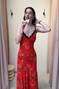 De Rosie Slip Jurk van Never Fully Dressed is rood met een all-over print van rozen, blaadjes en luipaard. Spaghettibandjes en een zwart kanten randje langs de V-hals maken ’m extra vrouwelijk. Stoer, sexy en elegant – precies goed dus.