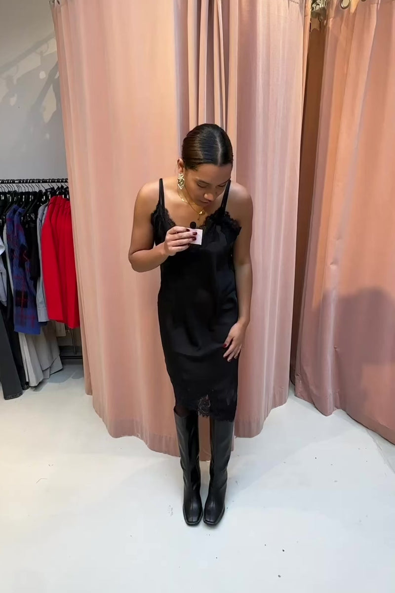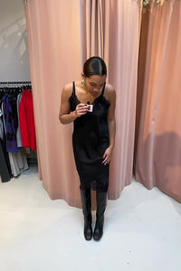 De Sorelle Kanten Jurk van Neo Noir is een lange satijnen jurk met spaghetti straps en een v-hals afgewerkt met kant. De onderkant heeft een asymmetrische fit én een kanten rand — vrouwelijk met een scherpe rand. Draag met een hak of juist met chunky boots voor instant contrast.