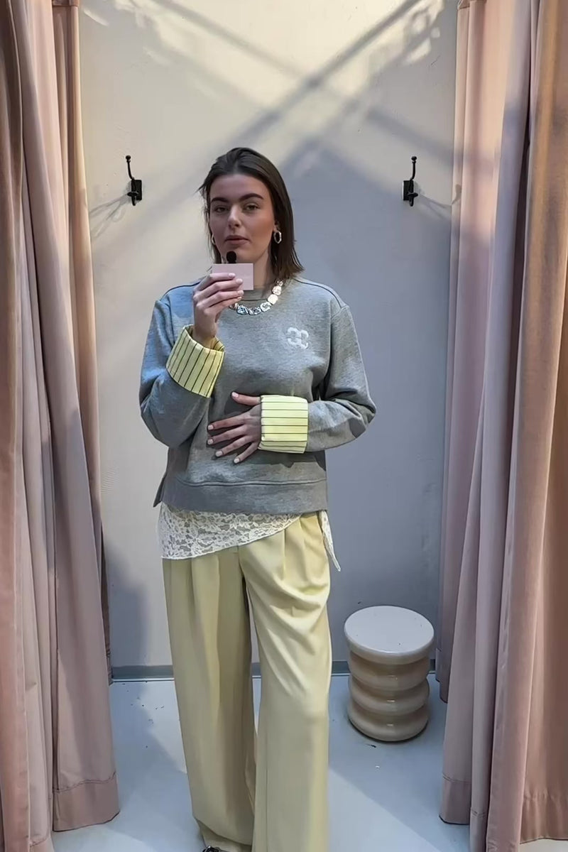 De DaniellaCC Cuff Sweater van Co’Couture is een grijze trui met een speels blouse-detail in geel rond de polsen. De mouwcuffs zijn afneembaar, waardoor je de trui op verschillende manieren kunt stylen voor een casual of meer opvallende look.