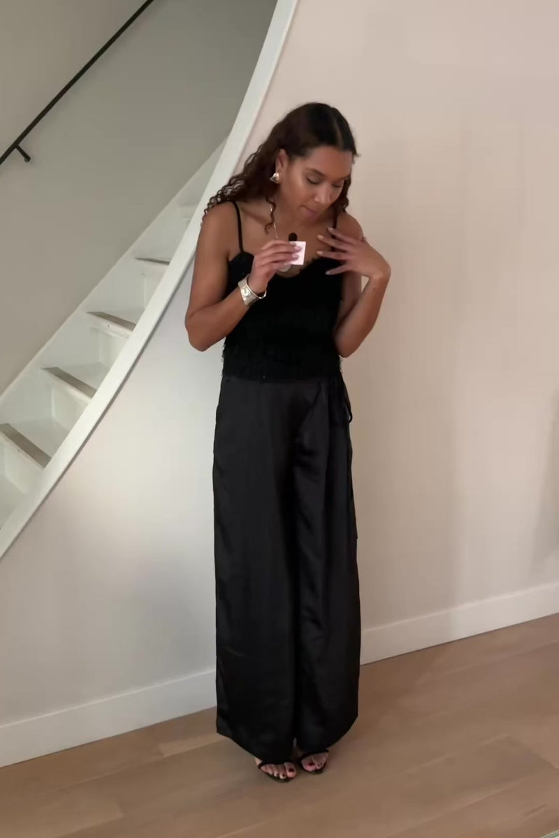 Deze zwarte satijnen pantalon heeft een elegant wrap-effect en wordt aan de zijkant vastgemaakt met een subtiele strik. De glanzende stof en flatterende pasvorm maken ‘m chic en vrouwelijk. Perfect voor zowel feestelijke gelegenheden als stijlvolle alledaagse looks.