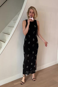 De Audrey Glitter Dress van Moss Copenhagen is een lange, zwarte bodycon jurk zonder mouwen, bezaaid met subtiele zilveren bloemen die glinsteren bij elke beweging. De aansluitende pasvorm benadrukt je silhouet, terwijl de glitters een feestelijke touch geven. Perfect voor een avond waar je wilt stralen.
