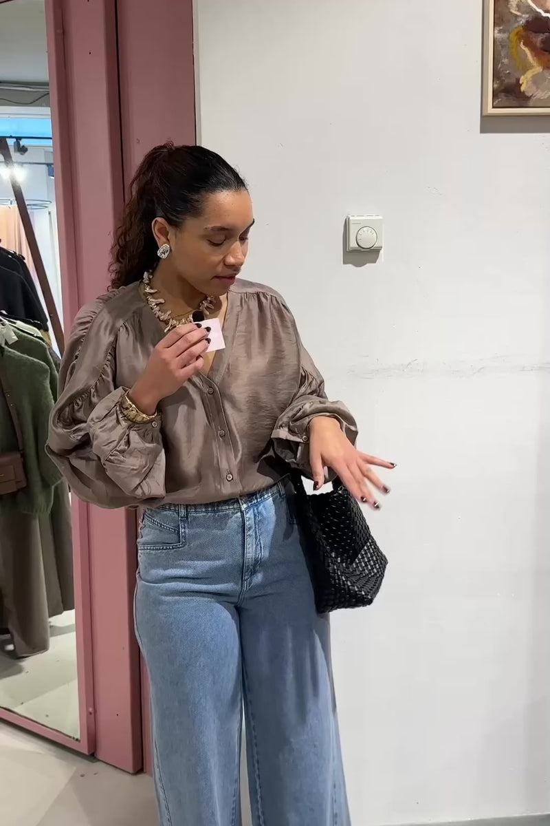 De MSCHRamona Rikkelia Blouse van Moss Copenhagen is een bruine blouse van zacht materiaal met bolvallende mouwen. De vijf kleine bruine knoopjes aan de voorkant geven de blouse een subtiel, verfijnd detail.