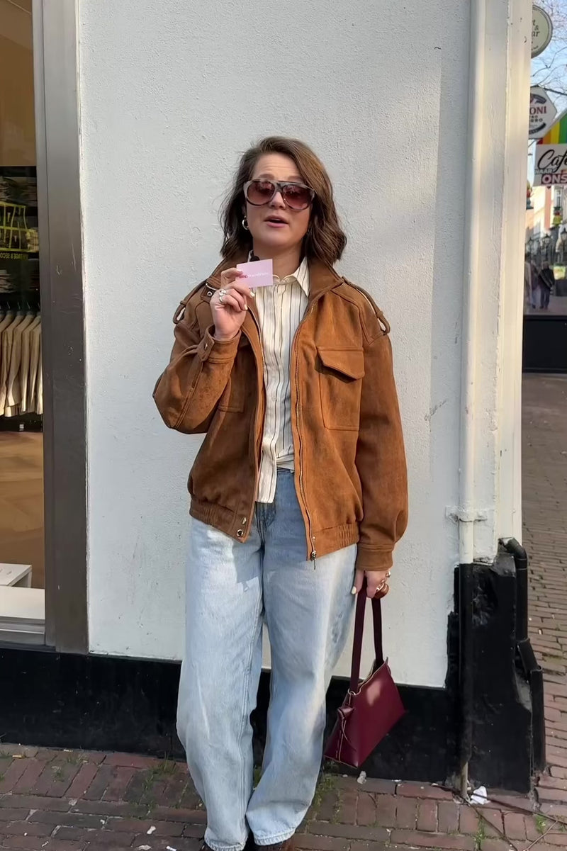 De Saar Suede Jacket is een jasje in een warme camel bruine tint met een stoere, verfijnde uitstraling. Het model heeft een ritssluiting en extra knopen. Perfect voor frisse lentedagen waarop je net dat extra laagje nodig hebt.