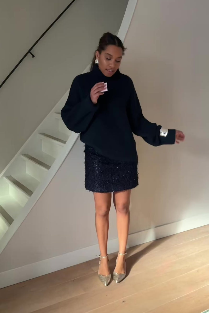 De Skimi rok van EDITED in donkerblauw is een echte eyecatcher. De korte rok is afgewerkt met glinsterende pailletten en een zachte, harige textuur die een speelse maar chique look geeft. Perfect voor feestelijke avonden of een statement outfit.